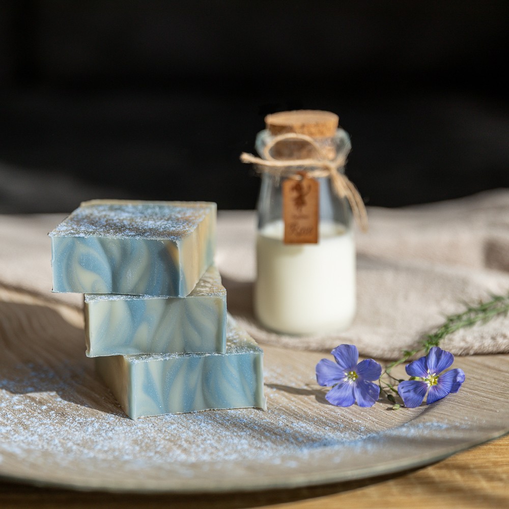 saponifiés à froid, ainsi que des cosmétiques et détergents naturels, en privilégiant les matières premières locales et biologiques dès que possible (lait de chèvre, de brebis, huiles de tournesol, de colza, miel…)Cette aventure a commencé lorsque ma première fille a développé de l’eczéma.